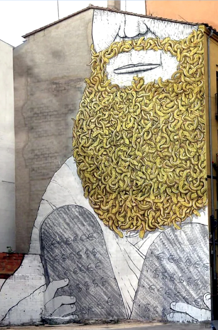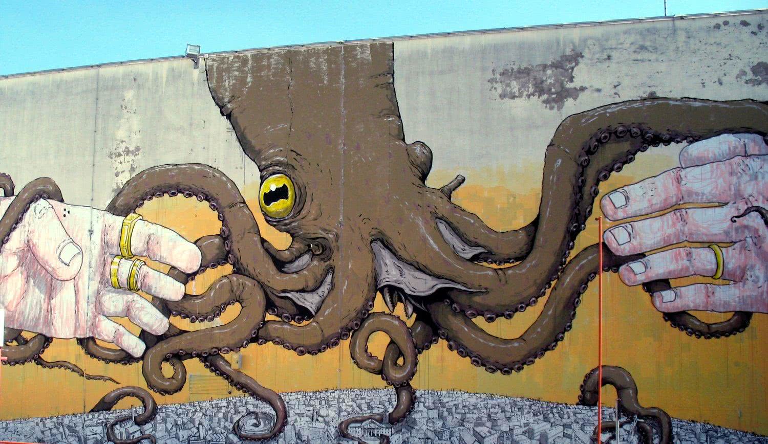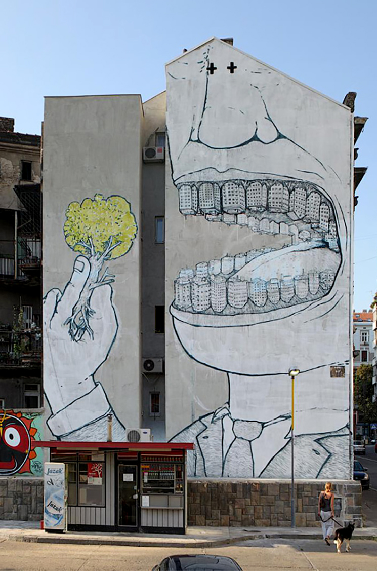 2014-ben Blu egy radikális lépésre szánta el magát. Berlin Kreuzberg negyedében két hatalmas murálját – amelyek addigra a város ikonikus képeivé váltak – egyszerűen feketére festette. Az akció a dzsentrifikáció elleni tiltakozás volt. Kreuzberg egykor alternatív művésznegyedként működött, de a street art és az underground kultúra népszerűsége idővel ingatlanfejlesztők és befektetők figyelmét is felkeltette. Blu szerint a város végül marketingeszközzé tette a művészetét, ezért inkább eltüntette saját munkáit. Ez a gesztus jól mutatja, hogy Blu számára a street art soha nem pusztán esztétikai kérdés volt, sokkal inkább a városi tér politikájáról szól. A graffiti eredetileg illegális gyakorlatként jelent meg – egyfajta taktikai beavatkozásként a város szövetébe. Amikor azonban a városok rájöttek, hogy a street art turisztikai és kulturális értéket is képvisel, elkezdték integrálni. Blu művészete így különös paradoxonba került: az egykori illegális graffitiművészből meghívott murálfestő lett. Berlinben, New Yorkban, São Paulóban vagy Krakkóban ma már gyakran hivatalos felkérésre dolgozik. De ez az integráció mindig hordoz magában feszültséget.