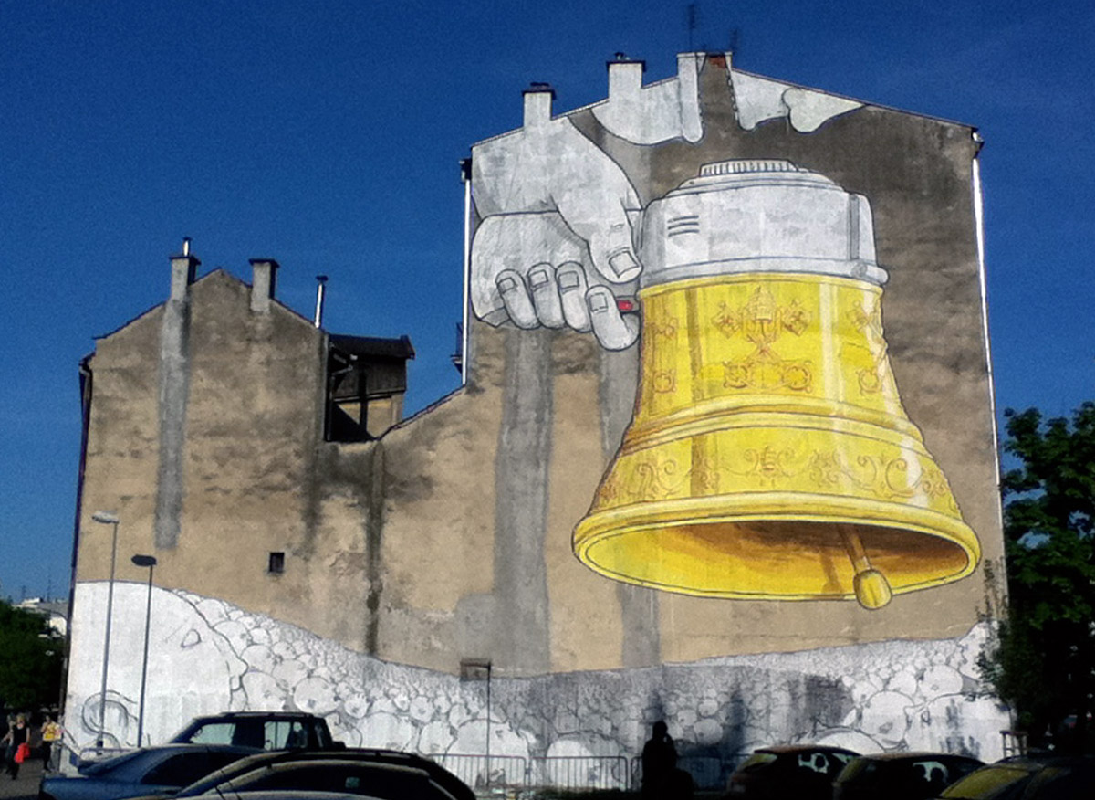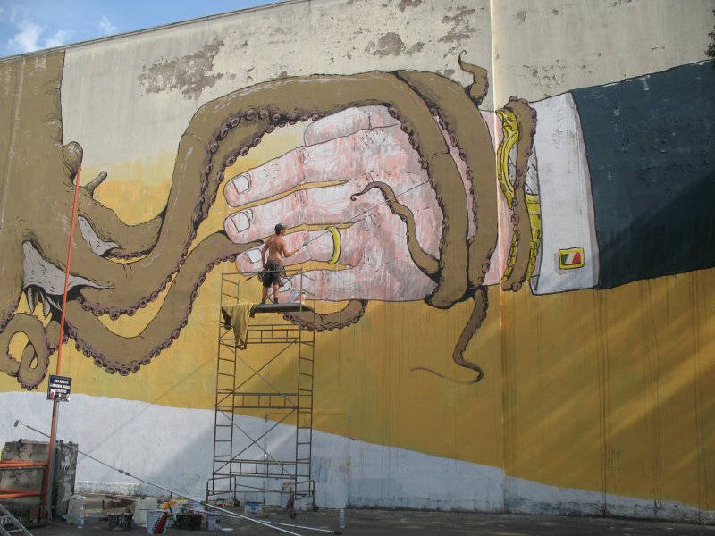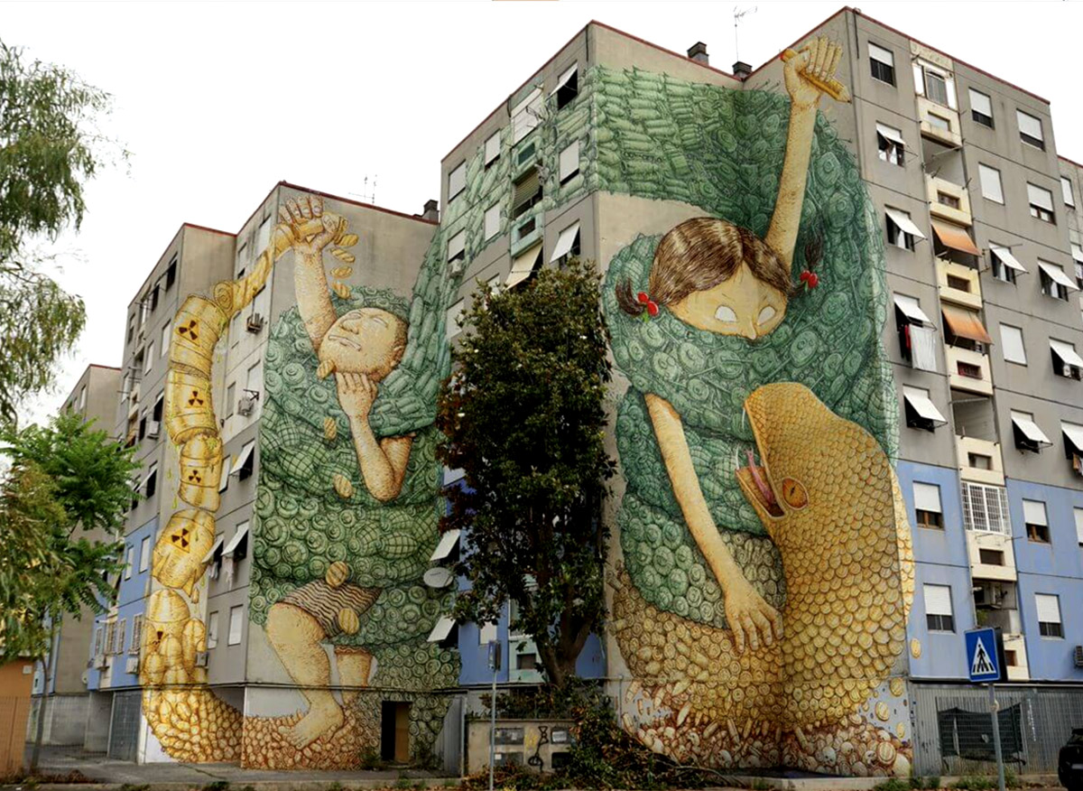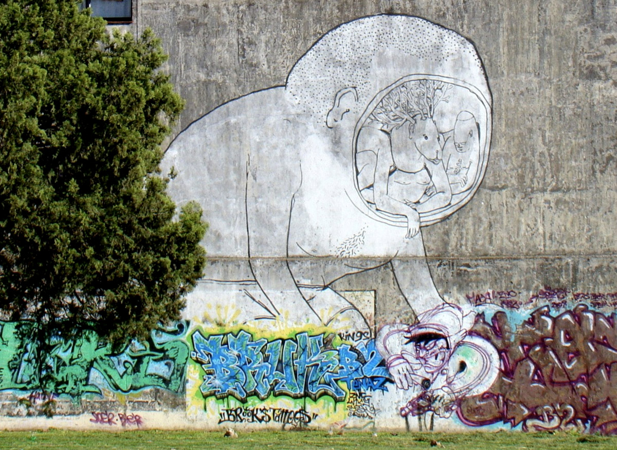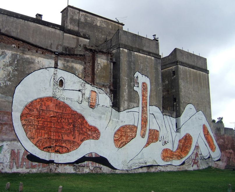 Csak halkan jegyzem meg: a teljes házfalakat beborító festési stílust erősen Blu nevéhez kötöm. Ilyenkor persze mindig előkerülnek az end-to-endre fújt vagonok példái, de a monumentális városi murálok gondolata mégis általa vált igazán meghatározóvá. Mások később kezdtek hasonló méretekben gondolkodni, gyakran nyilvánvalóan az ő hatására. Az első ilyen kísérleteit elhagyott ipari területeken valósította meg.