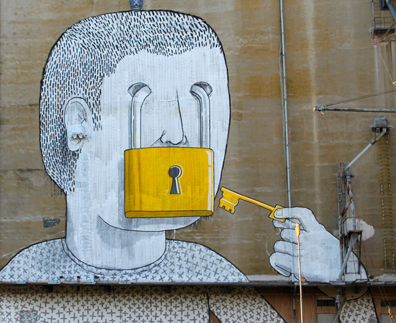 Blu munkáiban egy tudatosan felépített gondolati ív rajzolódik ki. Festményei gyakran azt a mechanizmust mutatják meg, amelyet mindannyian ismerünk, még ha ritkán fogalmazzuk is meg. Az intézmények világában sokszor nem az számít, hogy valami valóban hasznos-e, hanem az, hogy ki ül abban a jól fizető pozícióban, aki eldöntheti, mi számít fontosnak. A nagy tülekedés évszázada a miénk. Az egymásba gabalyodó érdekek végül egy hatalmas emberlabirintust hoznak létre. Blu falain ezek a labirintusok gyakran szó szerint is megjelennek: egymásba kapaszkodó testek, önmagukba záródó rendszerek, végtelen körforgások.