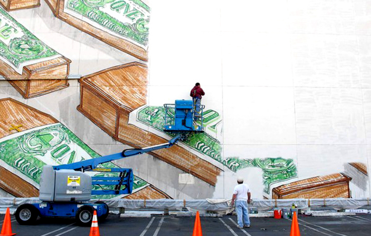 2010-ben a Los Angeles-i Kortárs Művészeti Múzeum (MOCA) felkérte Blu-t, hogy készítsen murált a Art in the Streets kiállítás számára. Blu egy erős politikai képet festett: katonák koporsóit, amelyeket nem amerikai zászló, hanem dollárbankjegyek borítanak. A múzeum vezetése végül lemeszeltette a művet. A hivatalos indok az volt, hogy a kép sértheti a szomszédos veteránkórház betegeit. A street art közösség azonban ezt nyílt cenzúrának tekintette.