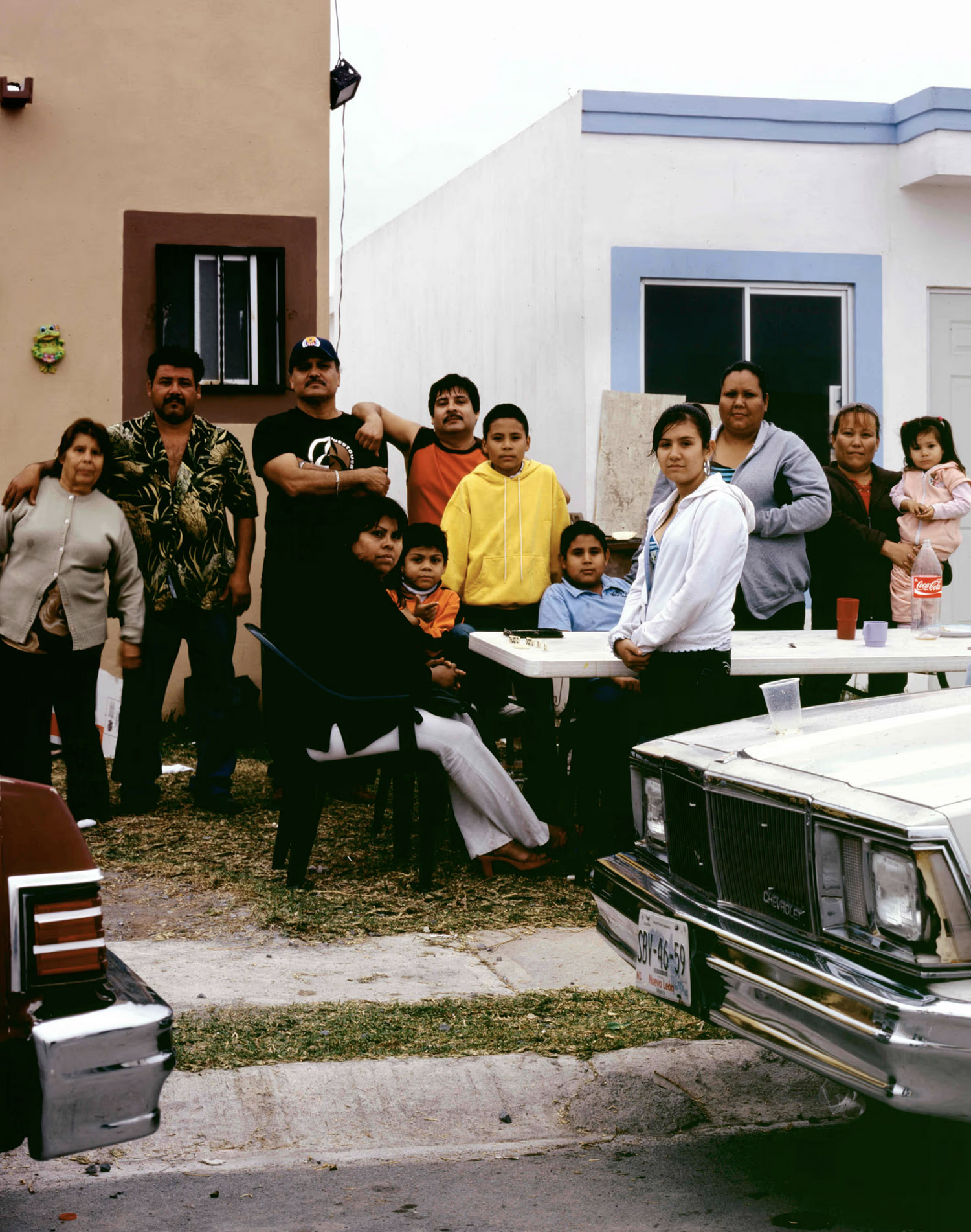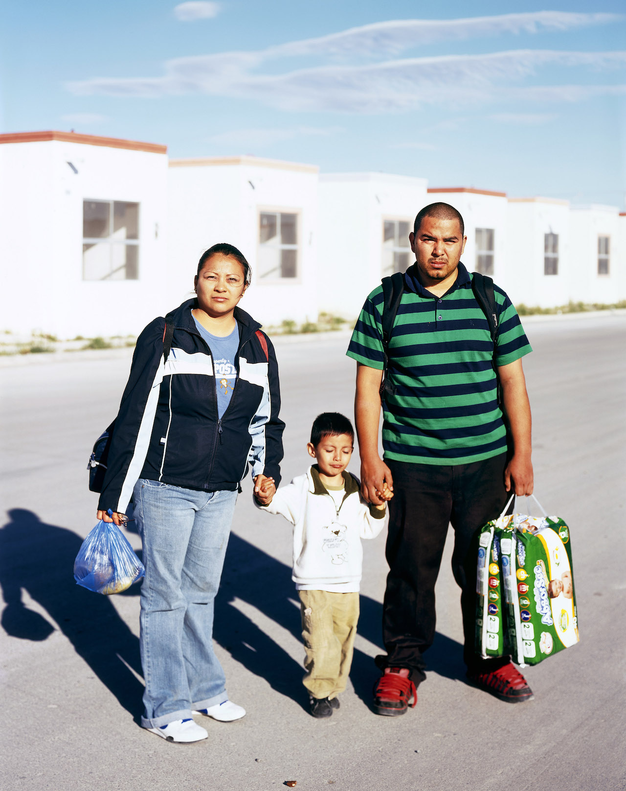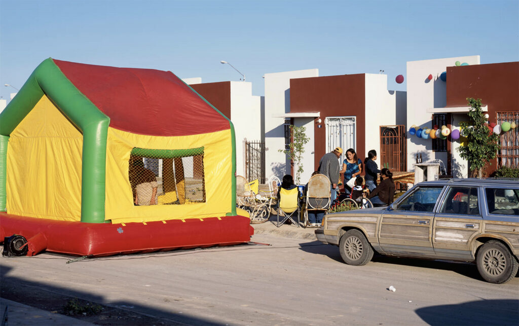 A lakástulajdon ígérete – stabilitás, felemelkedés, biztonság – itt sajátos ellentmondásba fordul. A házak uniformizáltak, a telkek szűkek, a környezet gyakran félkész vagy elhagyatott. Cartagena tudatos döntést hozott a fotózás módszertanában: „2006 óta fotóztam a házakat, ahol ezek a munkások élnek, főként Monterrey külvárosának új negyedeiben. A házak nagyon aprók és rosszul kivitelezettek, mégis az embereknek néha akár harminc évre szóló jelzáloghitelük van. Amikor ezeket a képeket készítettem, soha nem kértem meg őket, hogy engedjenek be. Úgy éreztem, tolakodó lenne, és kellemetlenül éreznék magukat, ha rájönnének, hogy azért emelem ki őket, amit vásároltak – hogy nekik csak ez jutott. Amikor láttam őket így utazni, az tökéletesen ábrázolta az életmódjukat és a lehetőségeiket.”