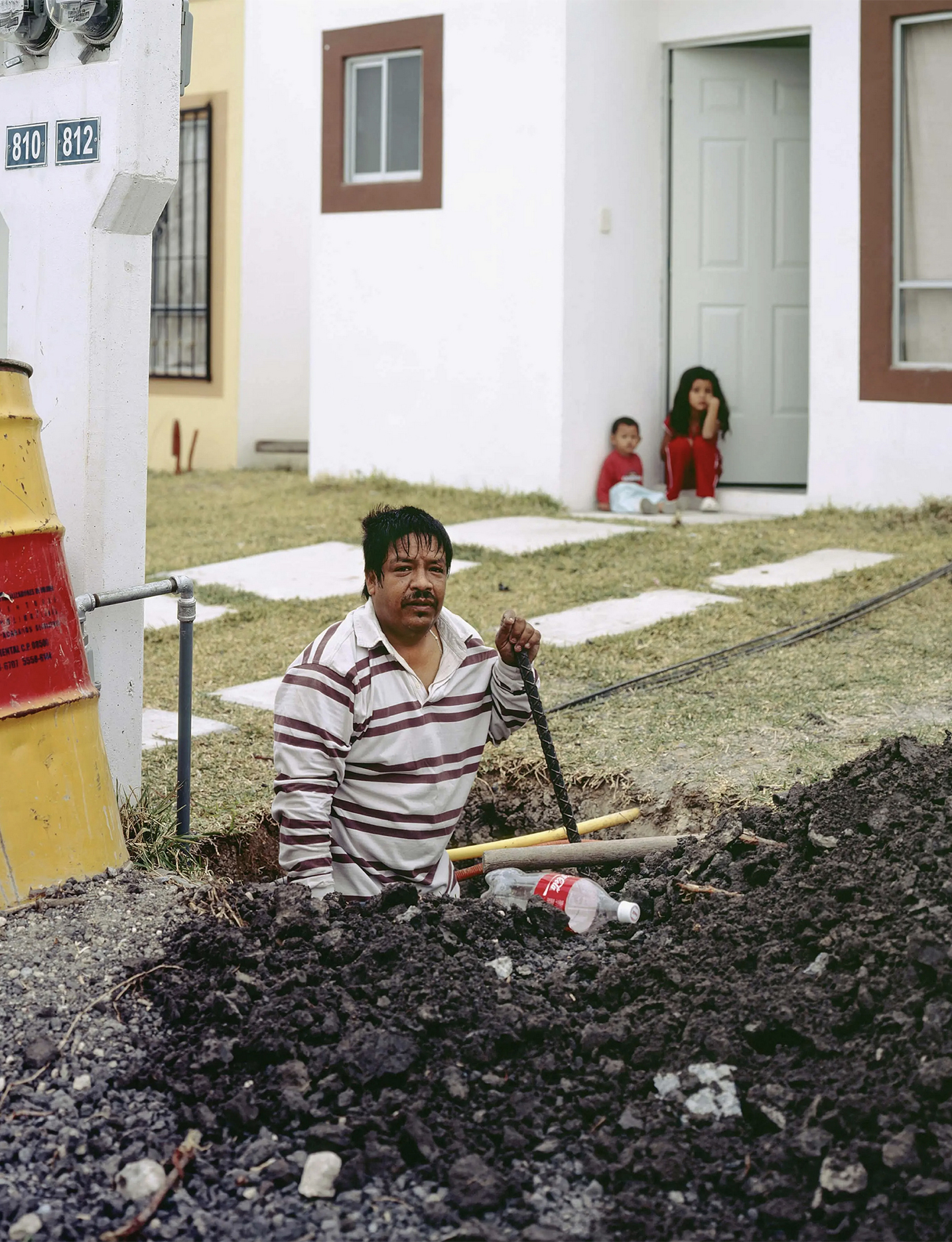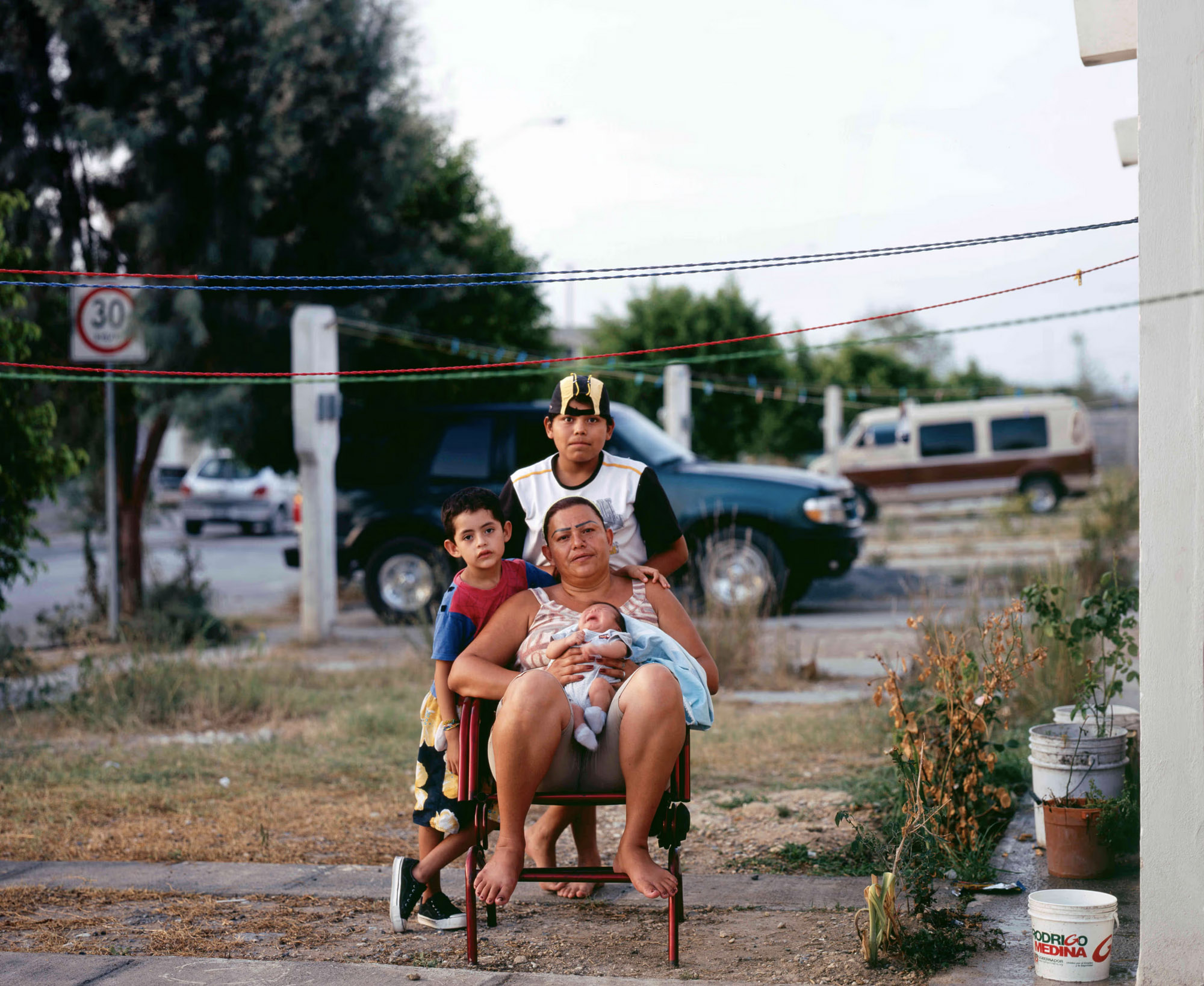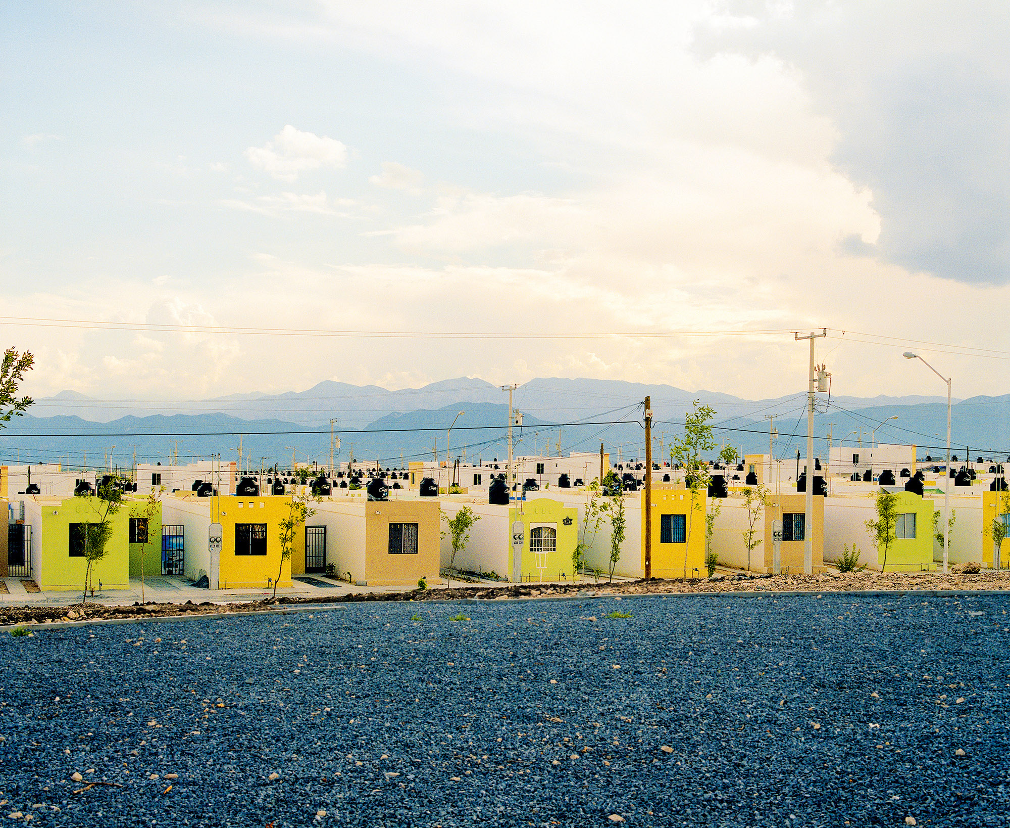A lakástulajdon ígérete – stabilitás, felemelkedés, biztonság – itt sajátos ellentmondásba fordul. A házak uniformizáltak, a telkek szűkek, a környezet gyakran félkész vagy elhagyatott. Cartagena tudatos döntést hozott a fotózás módszertanában: „2006 óta fotóztam a házakat, ahol ezek a munkások élnek, főként Monterrey külvárosának új negyedeiben. A házak nagyon aprók és rosszul kivitelezettek, mégis az embereknek néha akár harminc évre szóló jelzáloghitelük van. Amikor ezeket a képeket készítettem, soha nem kértem meg őket, hogy engedjenek be. Úgy éreztem, tolakodó lenne, és kellemetlenül éreznék magukat, ha rájönnének, hogy azért emelem ki őket, amit vásároltak – hogy nekik csak ez jutott. Amikor láttam őket így utazni, az tökéletesen ábrázolta az életmódjukat és a lehetőségeiket.”