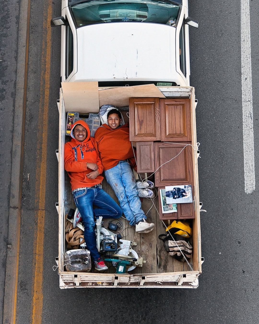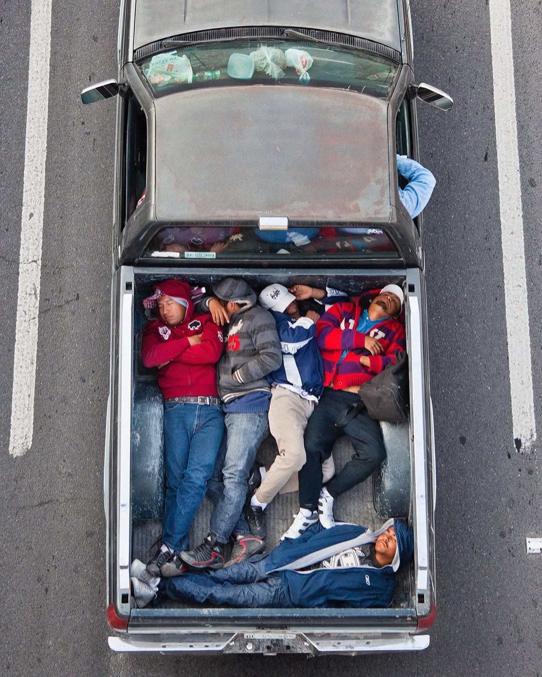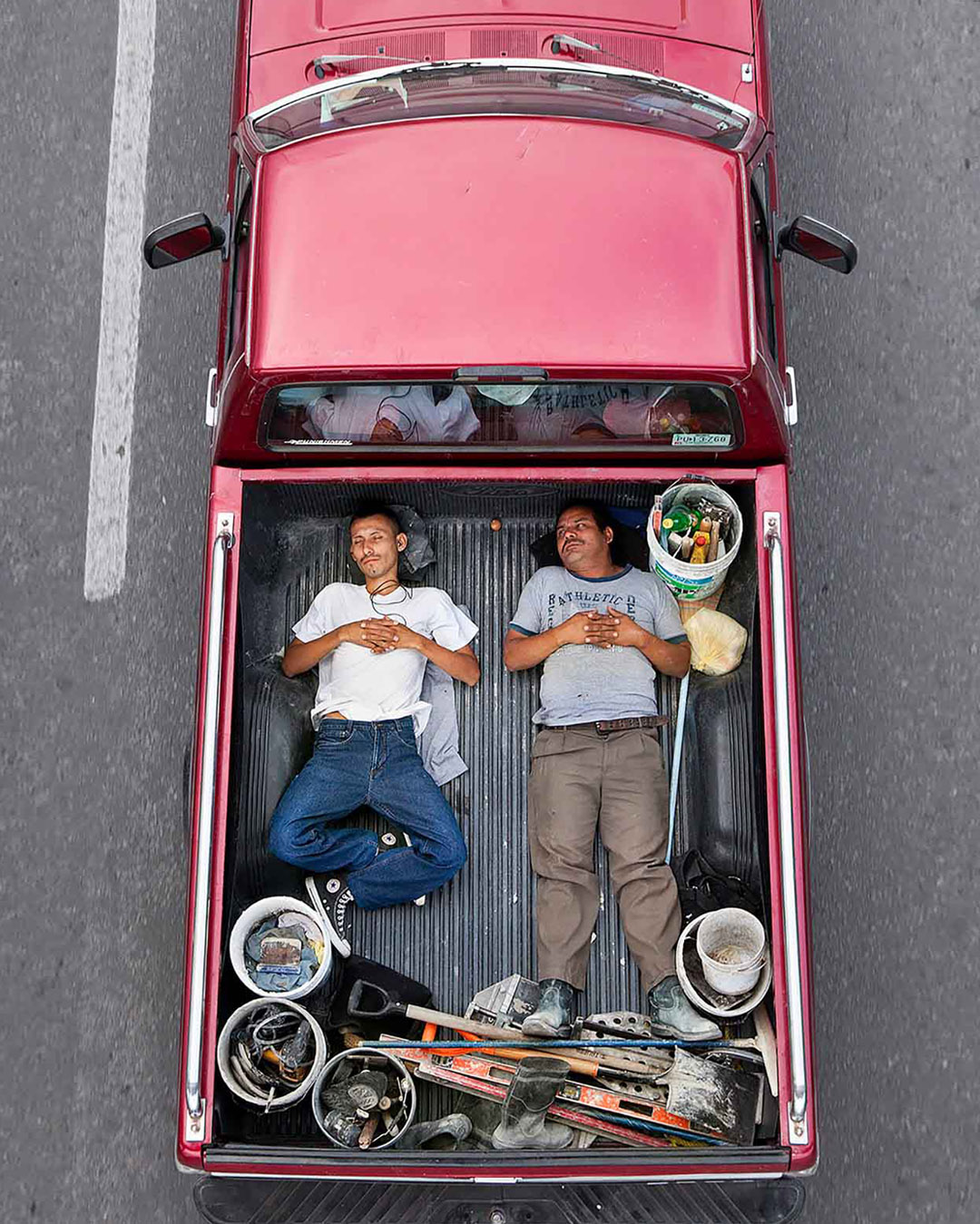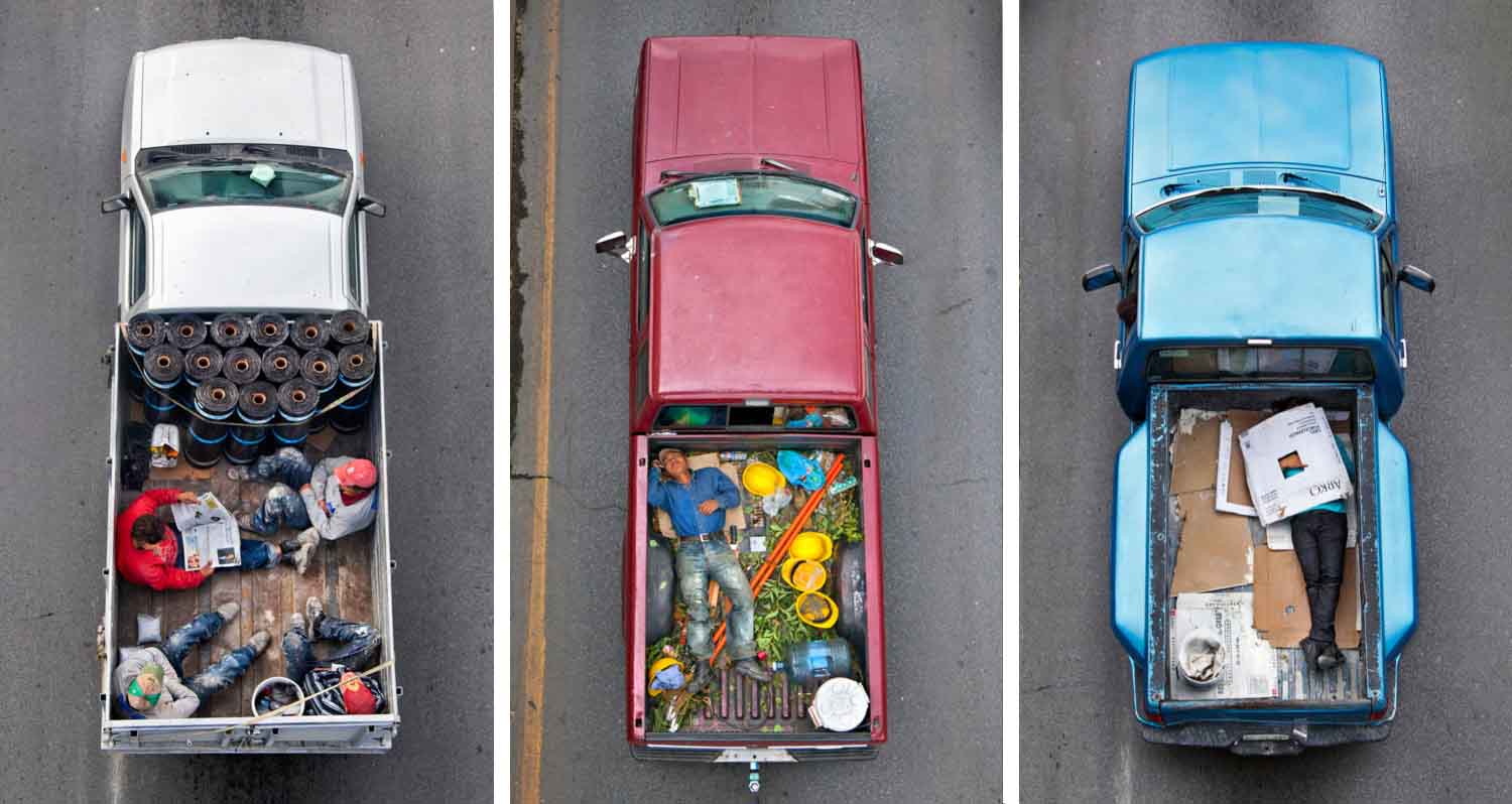 Ne tévesszen meg a téma leírása. Ezek nem száraz, szociológiai illusztrációk. Nem grafikonok képekben elmesélve. Hanem az élet, a maga puszta mivoltában. A hétköznapokba szivárgó melankólia, a váratlan humor és az ember makacs – olykor tragikomikus – alkalmazkodóképessége. Leghíresebb sorozata, a Car Poolers (2011–2012) ennek iskolapéldája. 2011-től kezdve minden reggel következetesen, szinte rituális pontossággal fényképezte felülnézetből az építőipari munkásokat, akik a mexikói 85-ös autópályán utaztak munkába. Nem buszon, nem vállalati járaton, hanem a vállalkozók pickupjainak platóján, egymás mellé préselődve. A 85-ös főút sajátos társadalmi tengely: összeköti Monterrey tehetősebb, központi negyedeit a perifériára szorult lakóövezetekkel és informális telepekkel. Ahol mindig van munkaerő. A képek egyszerre esztétikailag fegyelmezettek és társadalmilag nyugtalanítóak. A munkások teste mintázatot alkot a platón – szinte absztrakt kompozíciót. Csakhogy ez az absztrakció nagyon is konkrét valóságot fed. Természetesen itt mindenki be van jelentve és lepapírozva. Khmm.