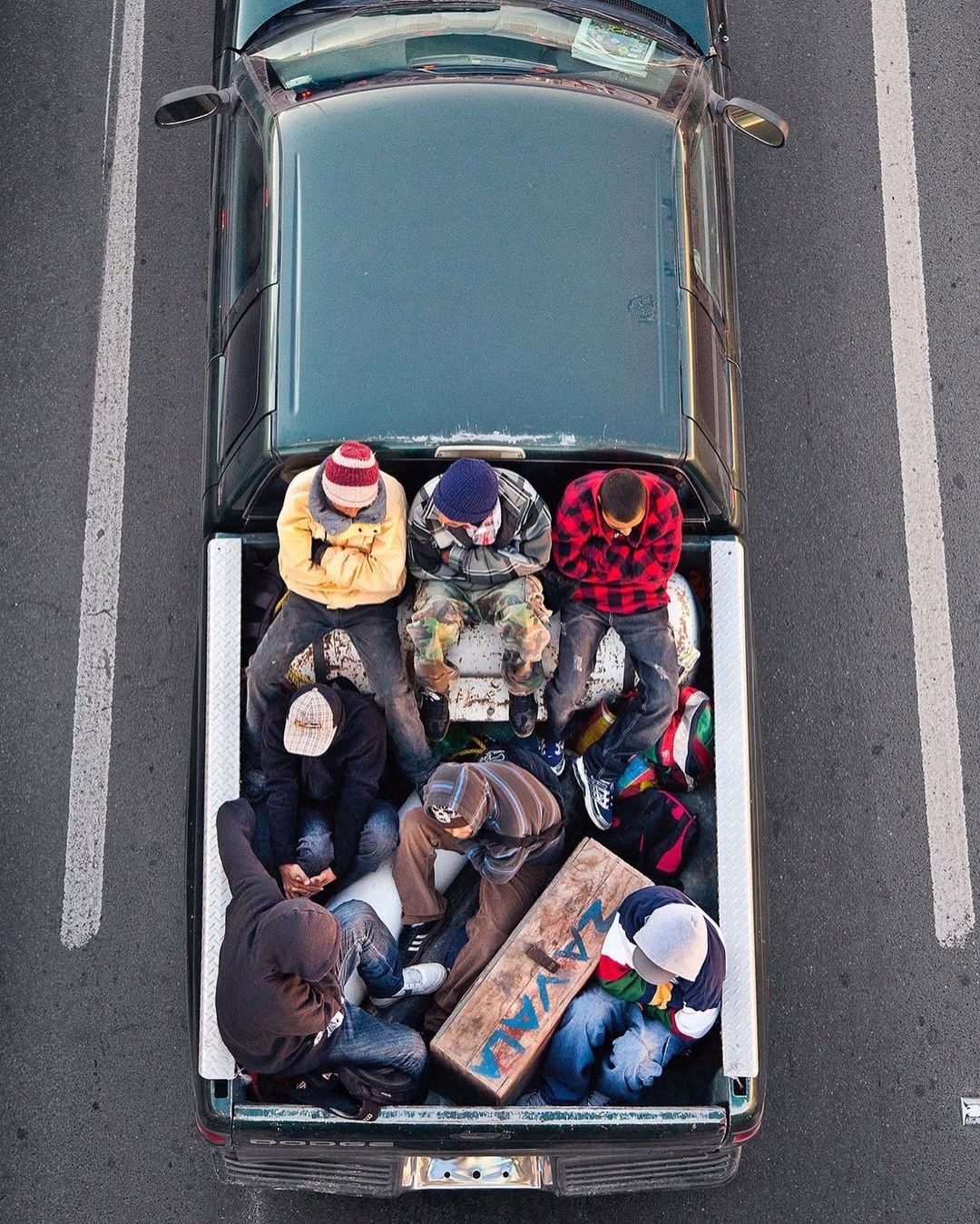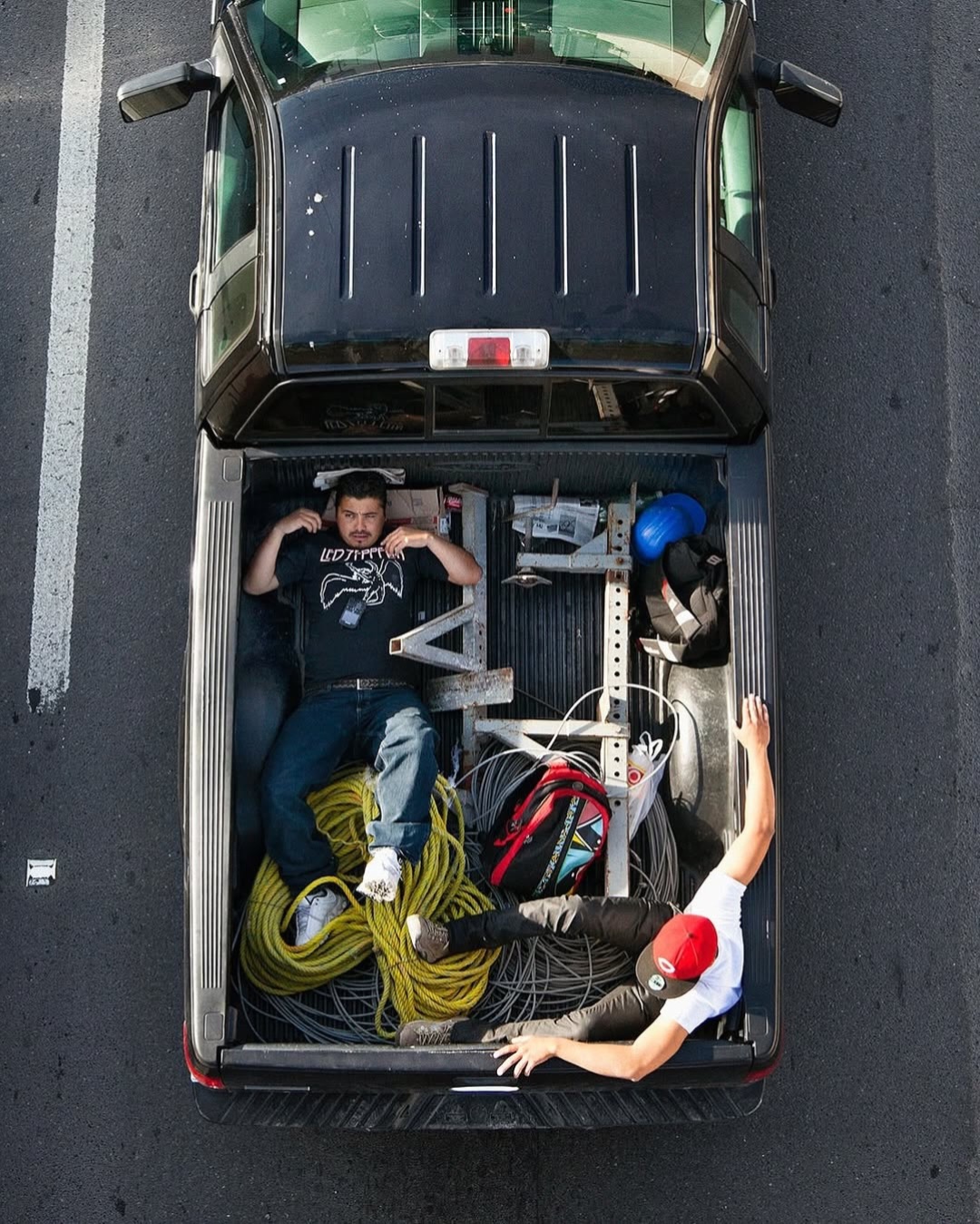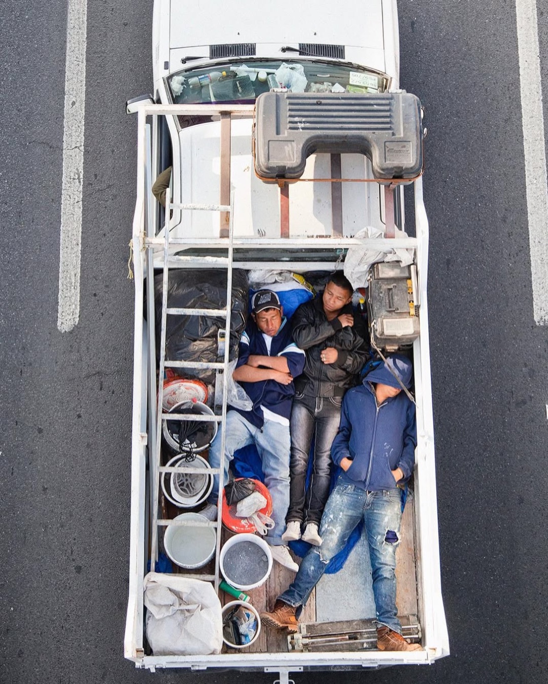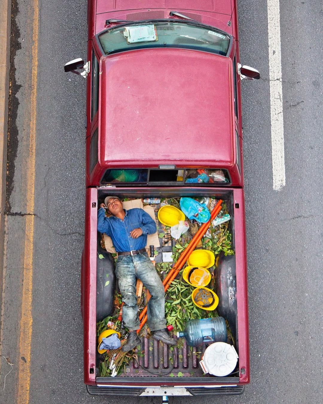 Ne tévesszen meg a téma leírása. Ezek nem száraz, szociológiai illusztrációk. Nem grafikonok képekben elmesélve. Hanem az élet, a maga puszta mivoltában. A hétköznapokba szivárgó melankólia, a váratlan humor és az ember makacs – olykor tragikomikus – alkalmazkodóképessége. Leghíresebb sorozata, a Car Poolers (2011–2012) ennek iskolapéldája. 2011-től kezdve minden reggel következetesen, szinte rituális pontossággal fényképezte felülnézetből az építőipari munkásokat, akik a mexikói 85-ös autópályán utaztak munkába. Nem buszon, nem vállalati járaton, hanem a vállalkozók pickupjainak platóján, egymás mellé préselődve. A 85-ös főút sajátos társadalmi tengely: összeköti Monterrey tehetősebb, központi negyedeit a perifériára szorult lakóövezetekkel és informális telepekkel. Ahol mindig van munkaerő. A képek egyszerre esztétikailag fegyelmezettek és társadalmilag nyugtalanítóak. A munkások teste mintázatot alkot a platón – szinte absztrakt kompozíciót. Csakhogy ez az absztrakció nagyon is konkrét valóságot fed. Természetesen itt mindenki be van jelentve és lepapírozva. Khmm.