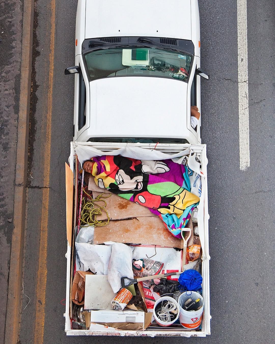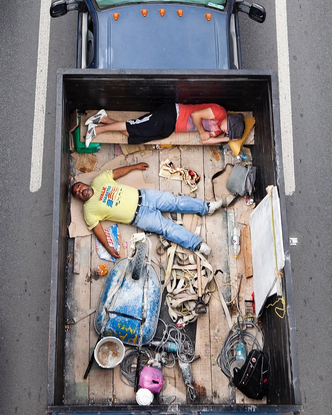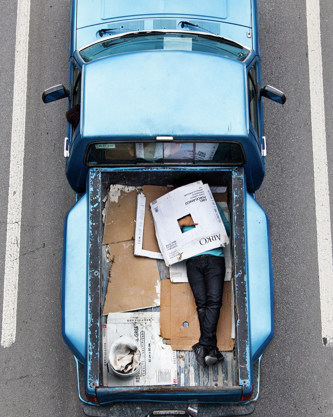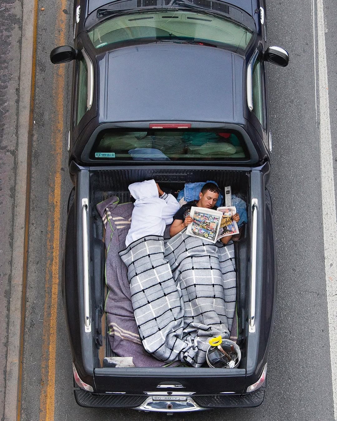 Ne tévesszen meg a téma leírása. Ezek nem száraz, szociológiai illusztrációk. Nem grafikonok képekben elmesélve. Hanem az élet, a maga puszta mivoltában. A hétköznapokba szivárgó melankólia, a váratlan humor és az ember makacs – olykor tragikomikus – alkalmazkodóképessége. Leghíresebb sorozata, a Car Poolers (2011–2012) ennek iskolapéldája. 2011-től kezdve minden reggel következetesen, szinte rituális pontossággal fényképezte felülnézetből az építőipari munkásokat, akik a mexikói 85-ös autópályán utaztak munkába. Nem buszon, nem vállalati járaton, hanem a vállalkozók pickupjainak platóján, egymás mellé préselődve. A 85-ös főút sajátos társadalmi tengely: összeköti Monterrey tehetősebb, központi negyedeit a perifériára szorult lakóövezetekkel és informális telepekkel. Ahol mindig van munkaerő. A képek egyszerre esztétikailag fegyelmezettek és társadalmilag nyugtalanítóak. A munkások teste mintázatot alkot a platón – szinte absztrakt kompozíciót. Csakhogy ez az absztrakció nagyon is konkrét valóságot fed. Természetesen itt mindenki be van jelentve és lepapírozva. Khmm.