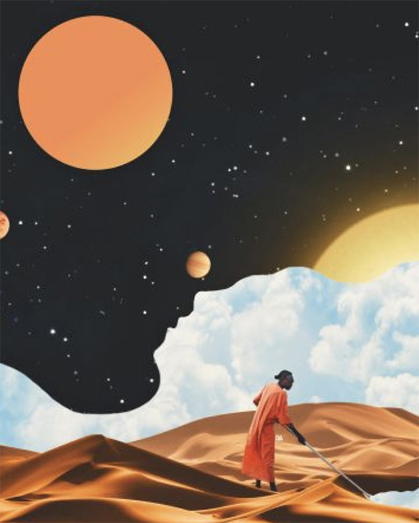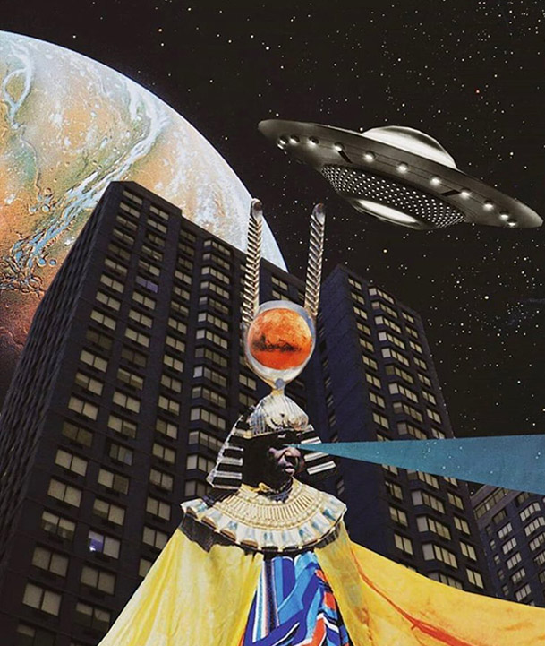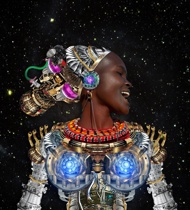 Ha nem veszik fejem a fekete artszaki zulu harcosok azt mondanám: az afroamerikai alkotók elsősorban a zenében, míg az afrikai művészek inkább a képzőművészetben mutatták meg leginkább az afrofuturizmus erejét. A kortárs afrikai vizuális művészetben számos alkotó hozott létre lenyűgöző afrofuturista univerzumokat. David Alabo és Nana Opoku kollázsai azonnal megragadják a tekintetet, mintha kaput nyitnának egy párhuzamos kozmoszba. Manzel Bowman digitális festményei úgy néznek ki, mintha eleve albumborítónak születtek volna. Cyrus Kabiru fura space-szemüvegei és szoborszerű viselhető tárgyai pedig a jövő és a performansz határán mozognak.