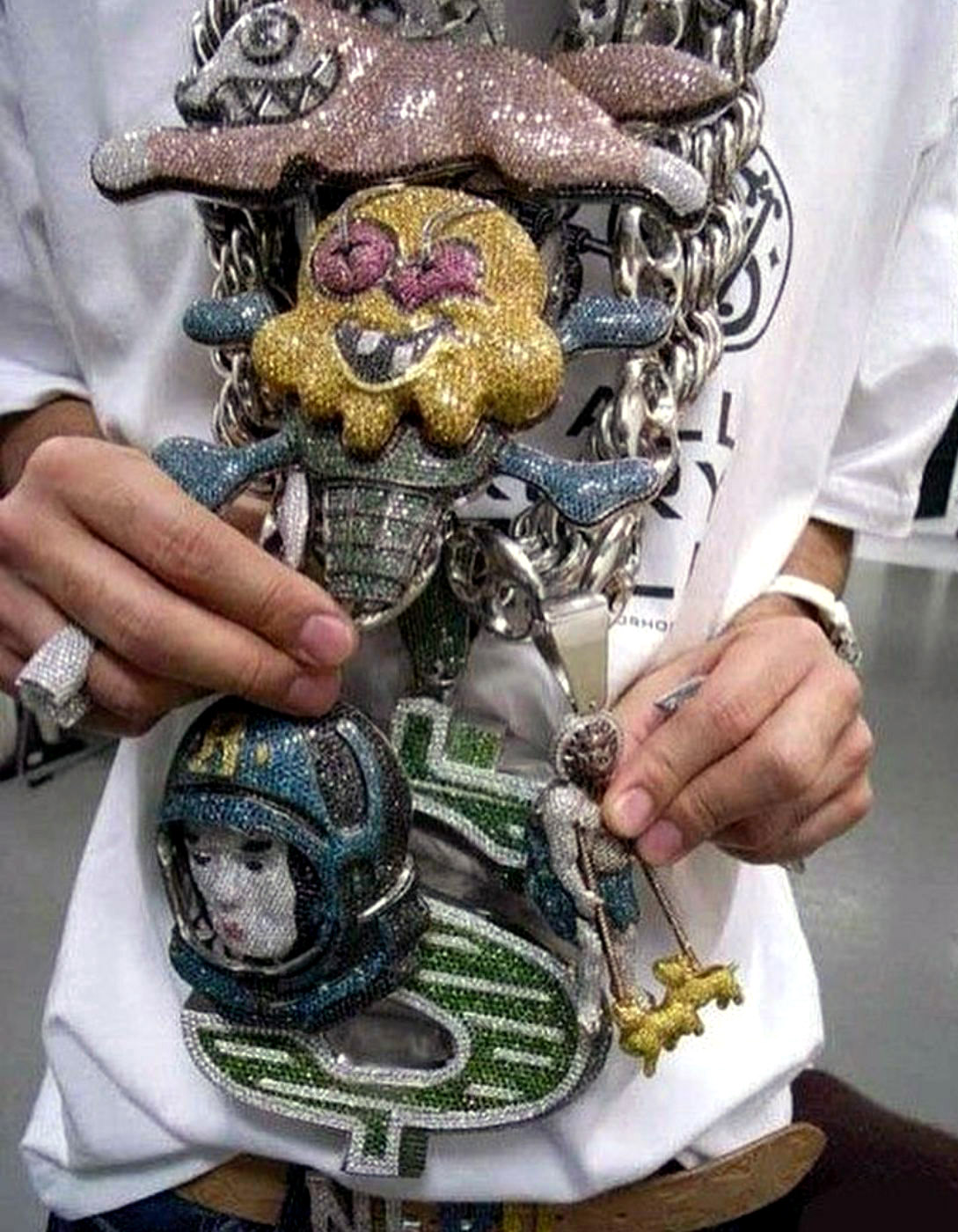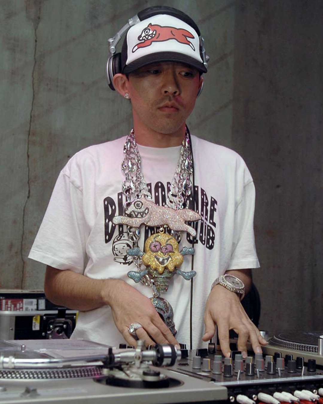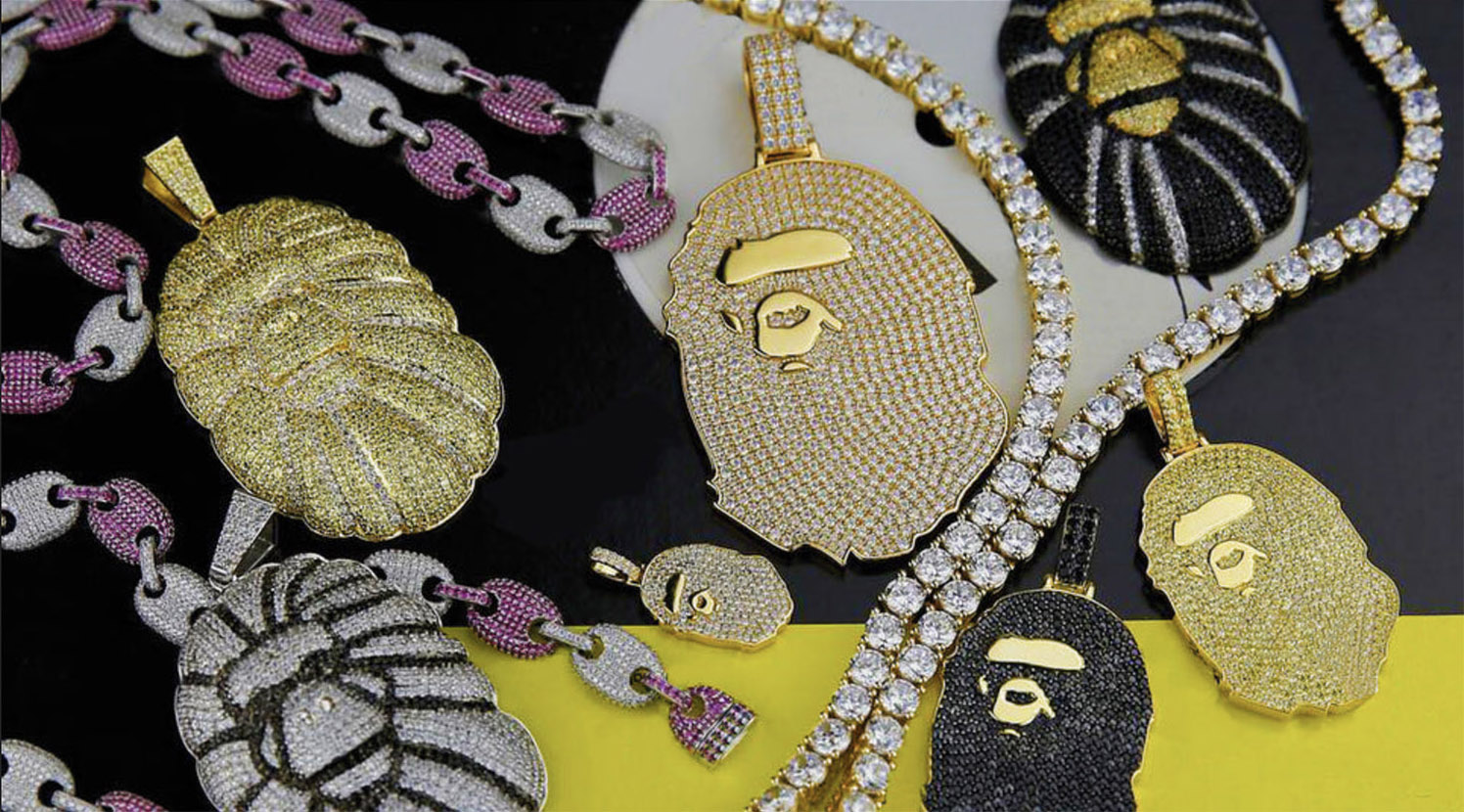 A platina és gyémánt drágakövek gyerekesen vidám dizájnokban jelentek meg – ez a stílus ma már alapvetésnek számít a hiphop kultúrában, de az irányt Nigoék mutatták meg először.